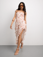 This pink bandeau dress is not here to play. Featuring a chiffon fabric, ruffle design and an abstract hem that’s giving art in motion. Style it with strappy heels to add a little attitude — she’s effortlessly fire.