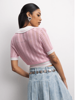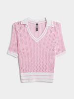 This pink golfer top’s bringing that soft-girl drip. Featuring a crochet fabric, crop fit and preppy collar vibe. Pair it with jeans, skirts, or cargos for an instant fit check.