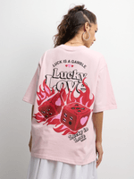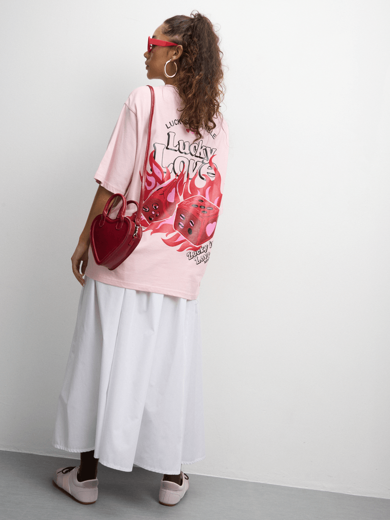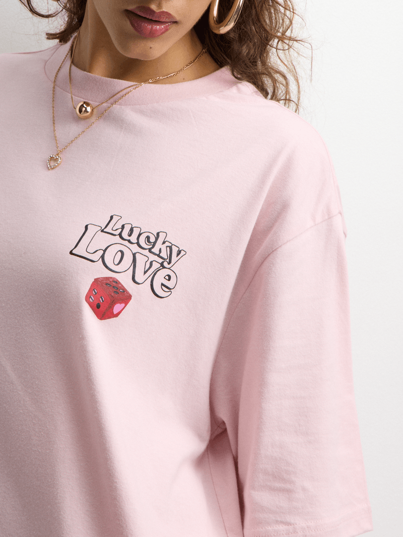Stay stylish with our Dusty Pink Lucky Love Dice Graphic Top. Made from soft cotton fabric with a crew neck and short sleeves. Perfect for adding a fun touch to any outfit. Always bring good luck with you!