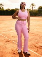 Introducing our Pink Sports lux Bootleg Legging! Stay stylish and comfortable during your workouts with the flattering front ruched detail. Made from a durable polyester blend. Embrace your active lifestyle with this versatile addition to your wardrobe.