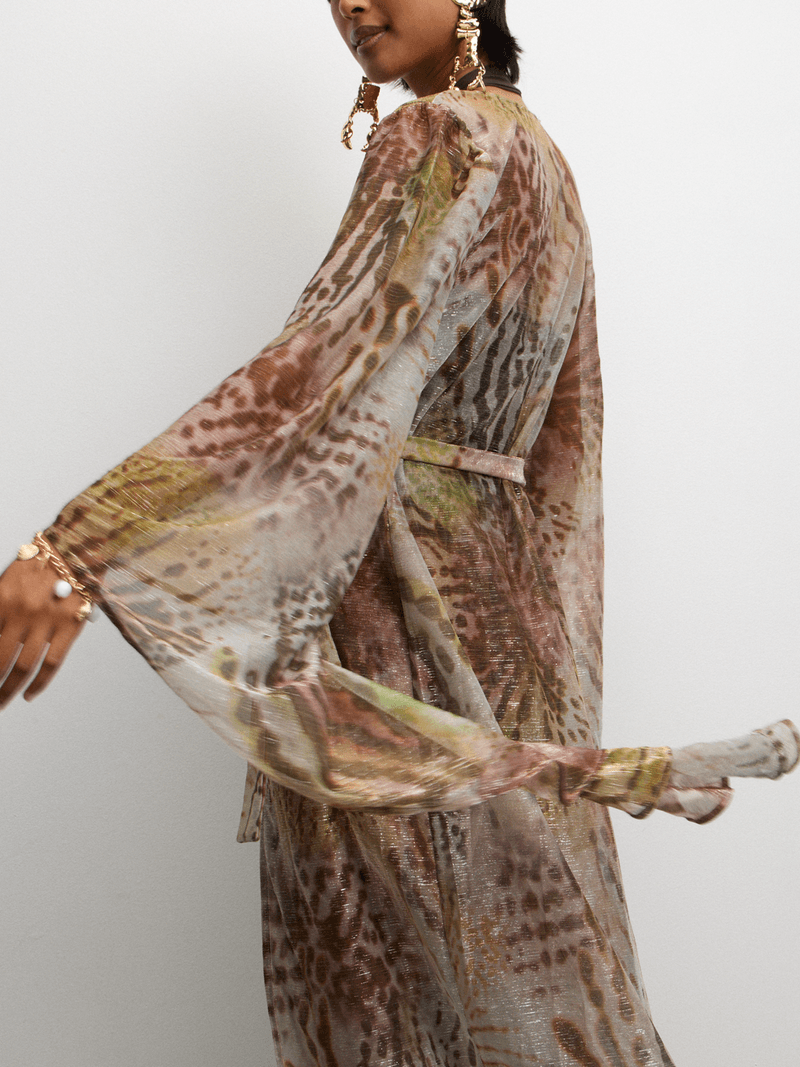 Elevate your summer style with The FIX's Women's Printed Lurex Co-ord Mesh Kaftan. This kaftan features a unique print and a relaxed fit. Perfect for beach days or casual outings.