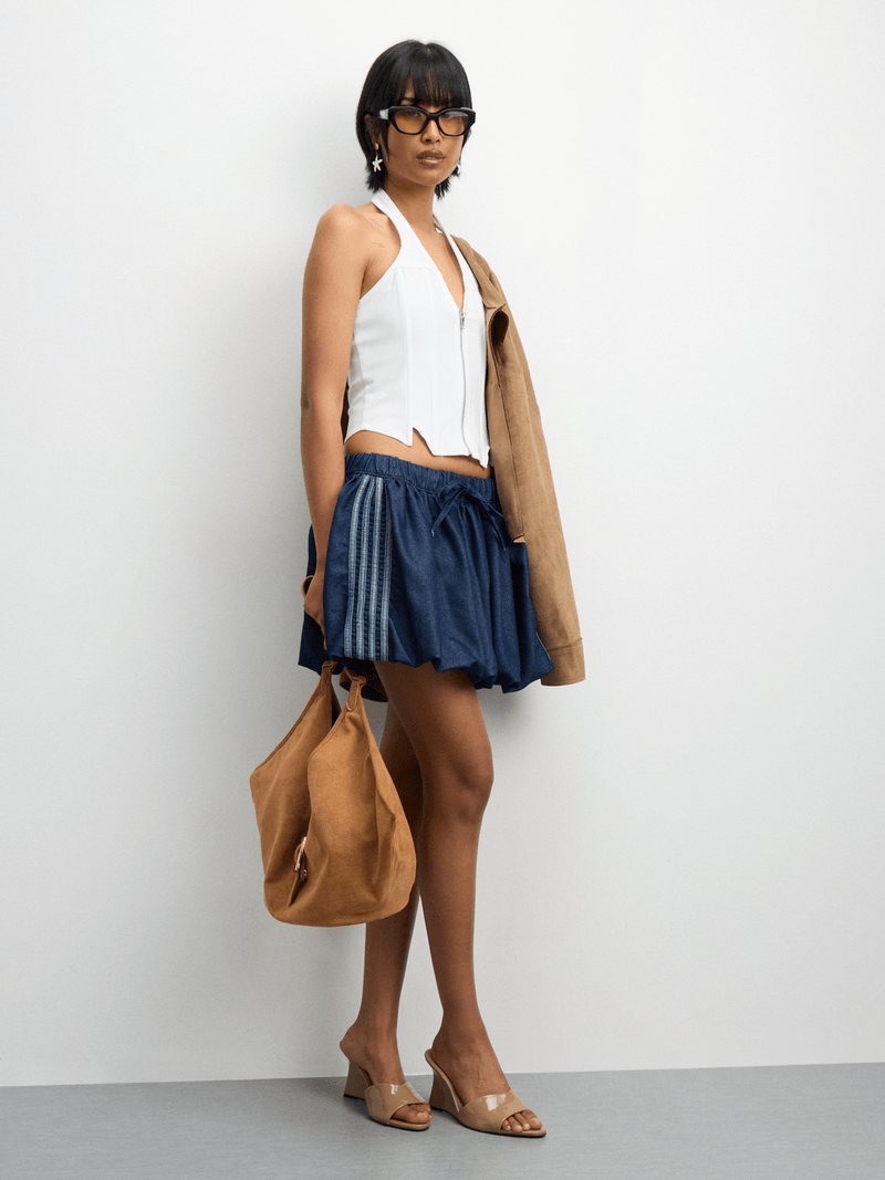 Introducing our stylish Raw Wash Denim Sporty Bubble Skirt! Made with high-quality denim fabric for a comfortable fit. Features a sporty bubble silhouette that's perfect for any casual look. Elevate your wardrobe with this versatile skirt that's sure to become a favorite!