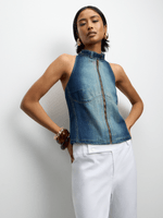 Elevate your casual look with our Women's Sand Spray Dark-Wash Denim Top. Featuring a stylish zip front design and crafted from high-quality denim, this top is perfect for any occasion.