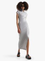 Sleek and sexy is the name of the game when you're rocking this fiyah li'l number. High neckline, short sleeves, side slit and scorching silver fabric. Pair it with a sexy tie up heel and a cute handbag for a look everybody finna love!