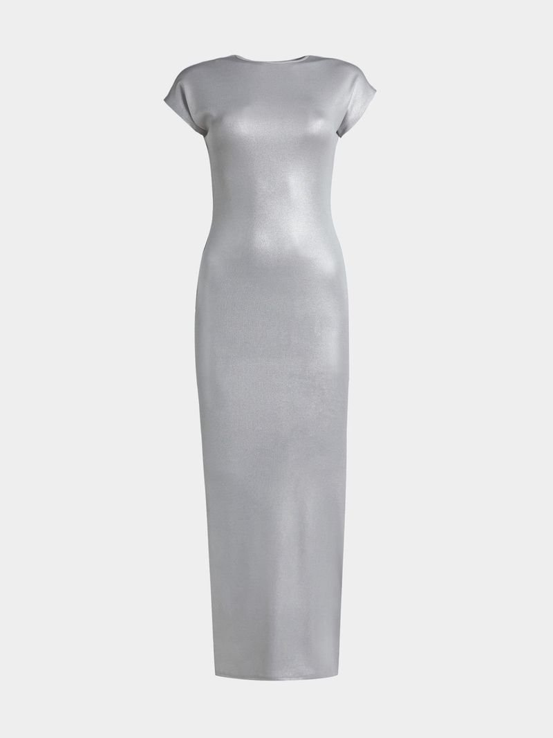 Sleek and sexy is the name of the game when you're rocking this fiyah li'l number. High neckline, short sleeves, side slit and scorching silver fabric. Pair it with a sexy tie up heel and a cute handbag for a look everybody finna love!
