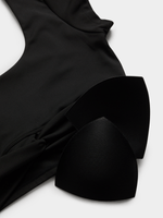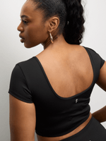 Step up your active wear game with our sleek black scoop neck twisted crop top. Made from a comfortable polyester blend, this short-sleeved top is perfect for workouts or everyday wear. Be stylish and comfortable wherever you go.
