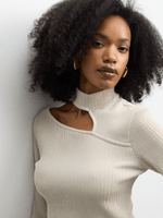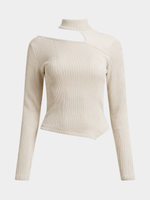 Introducing our chic asymmetrical turtleneck crafted from crepe knit fabric for a stylish look. Featuring a unique cut-out stone detail for a touch of edge. Add a modern twist to your wardrobe with this versatile piece.