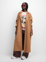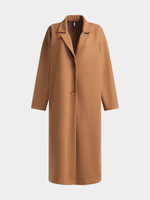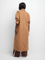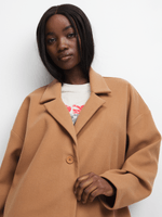 Step out in style with this tan longer length coat in a melton fabric. This chic coat is perfect for any occasion, with a flattering silhouette. It's designed to keep you warm and stylish. Embrace the cooler weather with this must-have wardrobe staple that's perfect for layering.