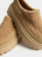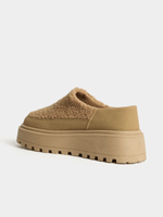 Slip into cozy comfort with our tan Sherpa chunky mules. An easy style for lounging at home or running errands. Features a plush Sherpa lining for warmth. Versatile and chic for all-day wear. Add a touch of comfort to any outfit with these must-have mules.