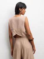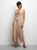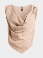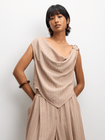 Introducing our cozy taupe stripe cowl top with hardware. Made from breathable linen, this sleeveless top features a stylish cowl neckline. Perfect for everyday wear, this top is a versatile wardrobe essential.