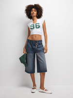 Cop this long bermuda shorts for yo szn 'drobe. Featuring a medium wash denim fabric and knee lenght fit. Teamed with a crop top or graphic tee, add a pair of your fav sneaks or slippers for a chill look.