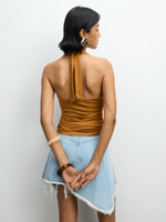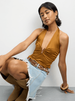 Elevate your style with our Tobacco ITY Halterneck top featuring a sleek V trim detail. Made from high-quality ITY fabric, this top is perfect for any occasion.