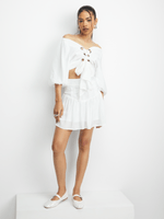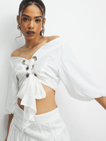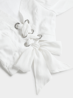 This white top is everything we are loving for the upcoming season. Featuring a woven fabric, puff sleeves and front eyelet lace up design. Style with a cute skirt or jeans and sneakers for a fresh finish.