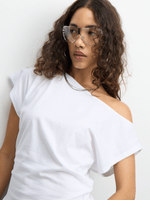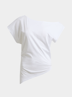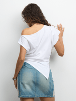 Elevate your casual style with our White Cotton Off-Shoulder Asym Top. Made with cool wash jersey fabric for a comfortable fit. Features an off-shoulder neckline and asymmetrical hem. Perfect for a relaxed day out. Embrace effortless fashion with this top.