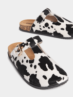Step out in style with the FIX women's white cow print mules. These trendy mules feature a unique cow print design that adds a playful touch to any outfit. Made with a comfortable combo material, these mules are perfect for all-day wear. Plus, with their easy slip-on style, they're convenient and versatile. Upgrade your shoe collection with these fashionable mules today!