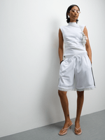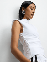 Elevate your style with this chic white crepe top featuring a trendy back tie and flattering shoulder pads. Made for cool wash and easy care. Crafted with high-quality crepe fabric. Perfect for any occasion, this top adds a touch of sophistication to your look. Stylish and comfortable.