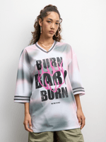 Elevate your casual look with our white oversized soccer tee featuring a cool burn baby graphic design. Made from soft birdseye fabric, this top is perfect for everyday wear. Pair it with some dad jeans and sneakers for the complete fit!