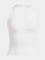 Get your wardrobe summer-ready with this top. Featuring a white rib fabric, sexy halterneck design and a crop fit. Pair with your favorite bottoms for a chic and effortless look.
