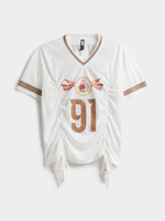 Elevate your casual look with The FIX white ruched top featuring front ties for a stylish touch. Made from birdseye fabric. Designed with a flattering v-neckline and short sleeves, it's a must-have wardrobe essential.