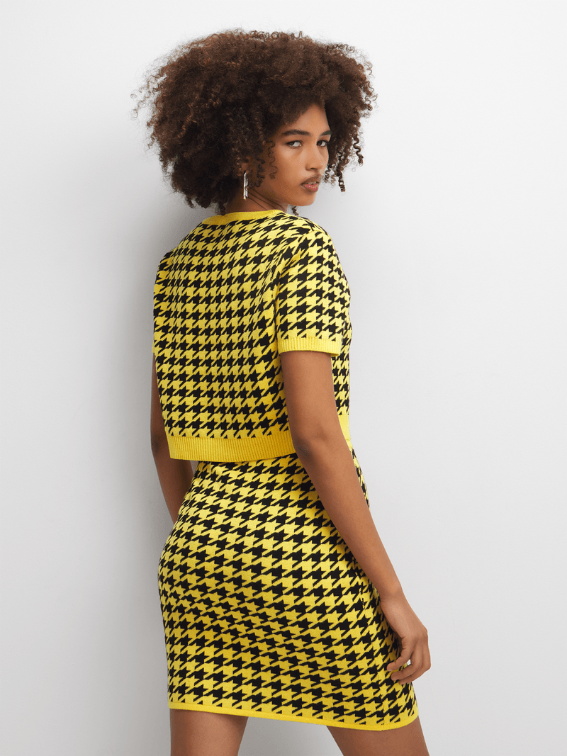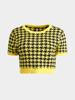 This yellow & black co-ord crop top is serving preppy princess vibes. Featuring a viscose blend fabric, bold houndstooth design and short sleeves. Cropped just right for that insta-worthy fit – it’s giving soft girl with a side of savage.