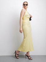 Slide into this lemon-drop moment. Featuring a yellow modal fabric, halter neck tie keeps it snatched up top, while the maxi length brings the drama down low. Paired with a cute heel & accessories for a scorching look.