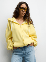 Stay cozy and stylish in our butter yellow premium fleece zip through hoody. Made with soft fleece fabric for ultimate comfort. Features a hooded neckline and long sleeves.