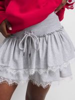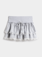 Upgrade your wardrobe with our stylish grey melange mini skirt. This brushed fleece skirt features charming ruffle and delicate lace trim for a feminine touch. Perfect for any occasion.