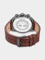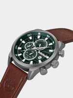 This stylish watch features a Gunmetal Plated round case, green multifunction dial and brown genuine leather strap.