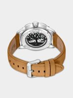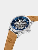 This stylish watch features a Stainless Steel round case, blue skeleton dial and tan genuine leather strap.
