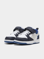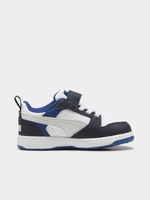 Introducing the Puma Rebound V6 Lo AC+ White/Blue Sneaker! Perfect for little ones on the go. Made with durable PU material for long-lasting wear. Comfortable and stylish design with blue accents. Get ready for some serious playtime with these sneakers!