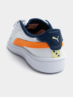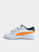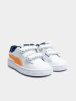 The Puma Smash 3.0 White/Orange Sneaker is perfect for little ones. Crafted from durable PU fabric, these stylish kicks are sure to keep up with their adventures. With a comfortable fit and vibrant colors, they're a must-have for active kids. Get ready to smash those playground goals in style!