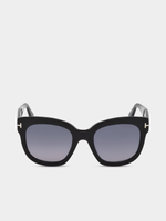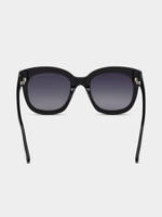 Bold geometric silhouette, glossy black frame, sleek silver mirror lenses, 100% UV protection, signature gold "T" accents on the temples. These glasses come with a protective case.