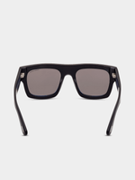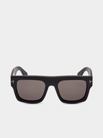 Contemporary Bold, square full-rim matte black frame, Smoke lenses, 100% UV protection, These glasses come with a protective case.