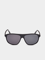Navigator square shape shiny black frame, Iconic "T" accents, 100% UV protection. These glasses come with a protective case.