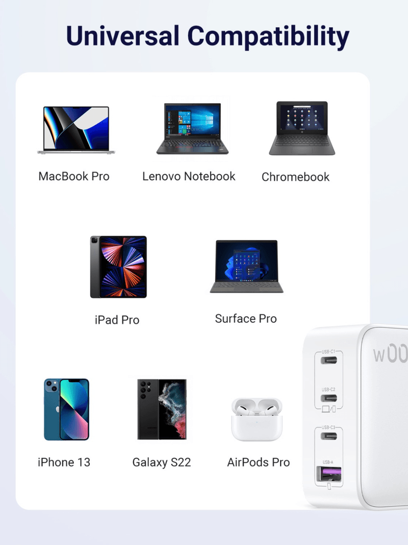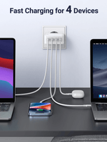 UGREEN 4 Port GaN PD Home Charger features the Type-C port with Power Delivery 3.0. It can fast charge your PD compatible devices. Your MacBook Pro 14 can be charged from 0% to 55% in just 30 minutes.