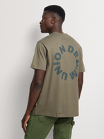 This one’s built loud, even when you’re not. The Union-DNM Men’s Boxy Circular Graphic Fatigue T-Shirt comes cut heavy with a wide, boxy shape that holds its ground. Solid cotton gives it structure and weight, while the circular graphic hits with intent, not decoration. The fatigue tone keeps it grounded, worn, and workwear-coded. This is the kind of tee that anchors denim, not the other way around.