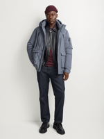 Step into elevated outerwear with the Union-DNM Men's Parka Slate Grey Jacket. Designed in a regular fit, it features a structured silhouette with a high neck hood for added coverage and style. The slate grey finish is complemented by bold Union-DNM branding along the zip placket and subtle detailing on the sleeve pocket. Functional zip and flap pockets add utility while maintaining a clean, modern look. Crafted from durable polyester, this jacket delivers warmth, comfort, and confident urban appeal.