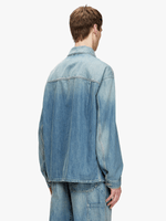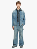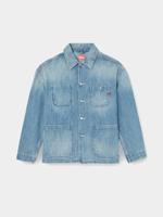 A workwear inspired piece, this shacket features wide patch pockets with squared corners, branded metal buttons, and reinforced stitching. A red embroidered D completes the style.
