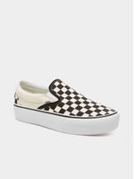 The Classic Slip-On Platform features sturdy low profile slip-on canvas uppers with the iconic Vans checkerboard print, padded collars, elastic side accents, and platform signature rubber waffle outsoles. Supplier style is (VN00018EBWW).