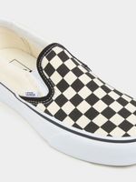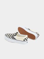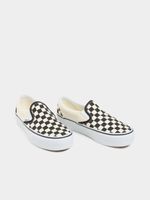 The Classic Slip-On Platform features sturdy low profile slip-on canvas uppers with the iconic Vans checkerboard print, padded collars, elastic side accents, and a 25,4 mm platform with signature rubber waffle outsoles.(Supplier Style:VN00018EBWW_ARC)