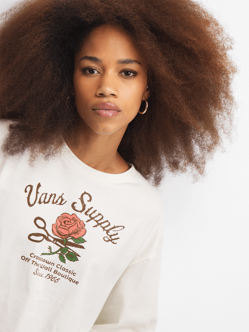 Introducing the Vans Supply Boutique Long Sleeve Cropped T-shirt in Marshmallow. Crafted from cotton material. Perfect for a relaxed and casual look. Supplier style is (VN000MDCFS81).