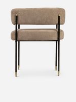 The Vera Dining Chair is wrapped in soft, tactile upholstery, and its sculptural form offers both comfort and style. The slim black metal legs with subtle brass-capped feet add a touch of glamour, balancing the chair's plush, organic feel.