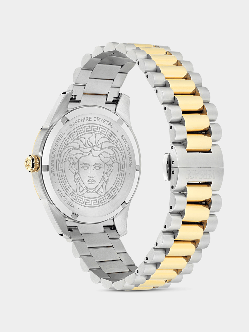 This collection features a sleek dial enriched with sunray dial and a 3d Medusa at 12h. The case is enriched with a GMT movement window at 6h and window date with magnificent glass at 3h.
