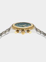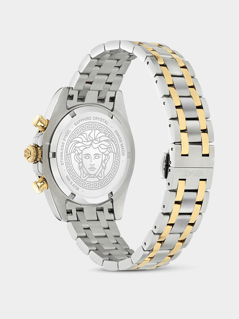 Bold and assertive, this chrono is perfect for gents' taste. It is embellished with 3D Greca on the top ring mixed with a subtle pattern. This collection is available both in bracelet and strap. the bracelet option features the Greca decoration on the middle links while the strap one has 3D Versace logo and Greca decoration in contrasting colours. This new chrono movement watch perfectly combines sporty look and Versace dna.