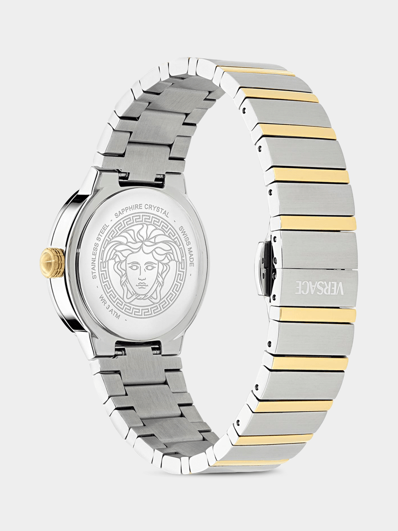This new collection recalls the feminine and elegant Versace soul and DNA. The 3d Medusa at 12h and the Versace logo repeated on the top ring give to this watch a unique and very Versace personality. To flag the mother of pearl dial in different shades.