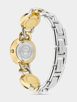 This elegant jewellery timepiece is back, now with brand new details. Its unique petite case is enriched with the tubular Greca on top ring, jewellery bracelet AND decorative plaques with bold 3d Medusa at 12h and 6h. This eye-catching collection has been executed with diamonds indexes on one version.