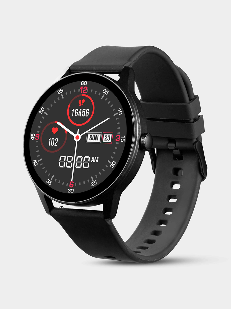 Monitor your activity with the Volkano Fit Soul Series Smart Watch. Waterproof with a Black Plated case, rotary dial and touch screen, and black silicone strap. Features include heart rate monitor, BT calling, 100 sports modes, pedometer, calorie tracker, and notifications for calls and messages.