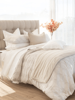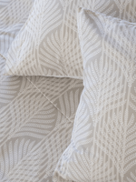 Woven from silky 300 thread count cotton sateen, this design features delicate feather-like motifs layered over a subtle tonal stripe. Soft nude tones and fine detailing create a graceful look with a smooth, luxurious finish.