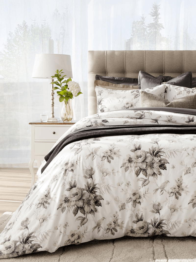 Graceful and refined, the Gabriella Nude Duvet Cover Set is crafted from 300 thread count cotton sateen for a silky-soft feel and understated sheen. A timeless white base is adorned with beautifully detailed floral bouquets in soft nude tones, enhanced by charcoal shading that adds depth and dimension to the classic design.