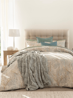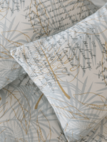 The Gwen Sage duvet cover set is crafted from 100% brushed cotton, featuring layered botanical leaves and delicate script in calming sage tones. Soft and breathable, this nature-inspired design brings a relaxed, cosy feel to a softly styled winter bedroom.